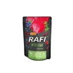 mięso i produkty pochodzenia zwierzęcego 65% (mięso z dziczyzny 4%), owoce (borówka amerykańska 2%, żurawina 2%), substancje mineralne, oleje i tłuszcze (olej lniany 0,2%), tymianek suszony 0,01%.Składniki analityczne